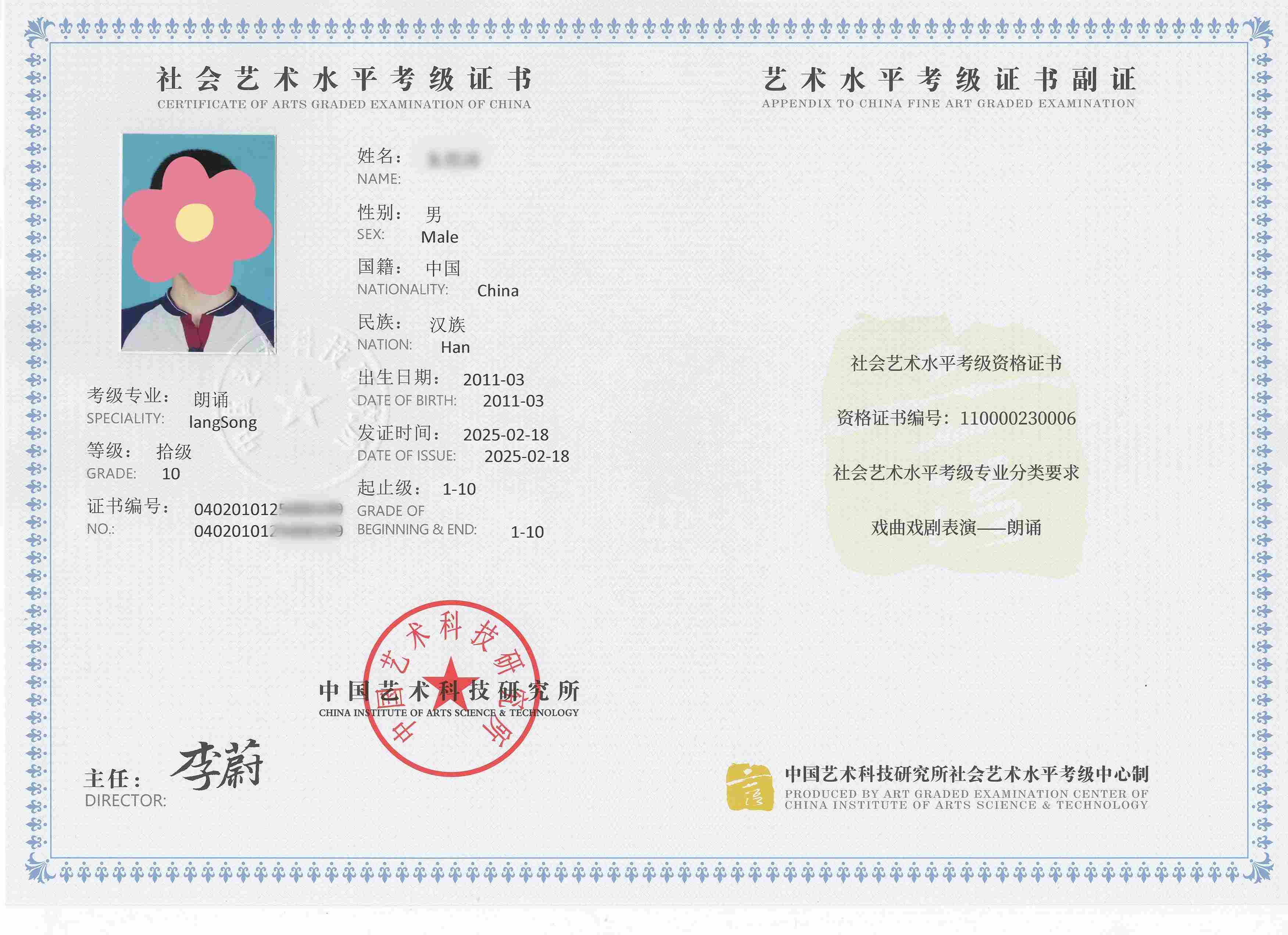 通过考级者,自从主考单位考级中心接收考试资料起60个工作日(工作日不含周末、国家节假日时间)可领取中国艺术科技研究所为其颁发由社会艺术水平考级中心监制的《社会艺术水平考级证书》。